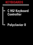 C952 KEYBOARD CONTROLLER 2 Modes: Keyboard or Arpeggiator 2 independent Sub-Audio-Oscillators (Modulation and Arpeggiator Speed) 2 Wheel Controller: Modulation and Pitch Retrigger / Legato Switch Hold Switch and external Jack for ARP. Hold function Glide Speed Pot and ON/OFF Switch Additional Jacks on Back Panel: HOLD, EXT. CLOCK, TRANSPOSE IN, CYCLE OUT, GATE OUT, CV OUT*, MIDI OUT. *Note: The C952 has a 2nd CV-Output connected to the sleeve of the CV-OUT. To activate this mode, simply use an insert cable (TRS to two mono jacks out). This enables the player to play 2 voice chords. Please keep in mind that the C952 is offered as a monophonic keyboard. In the ARP-MODE, the 2nd voice plays the history of voice ONE. |
